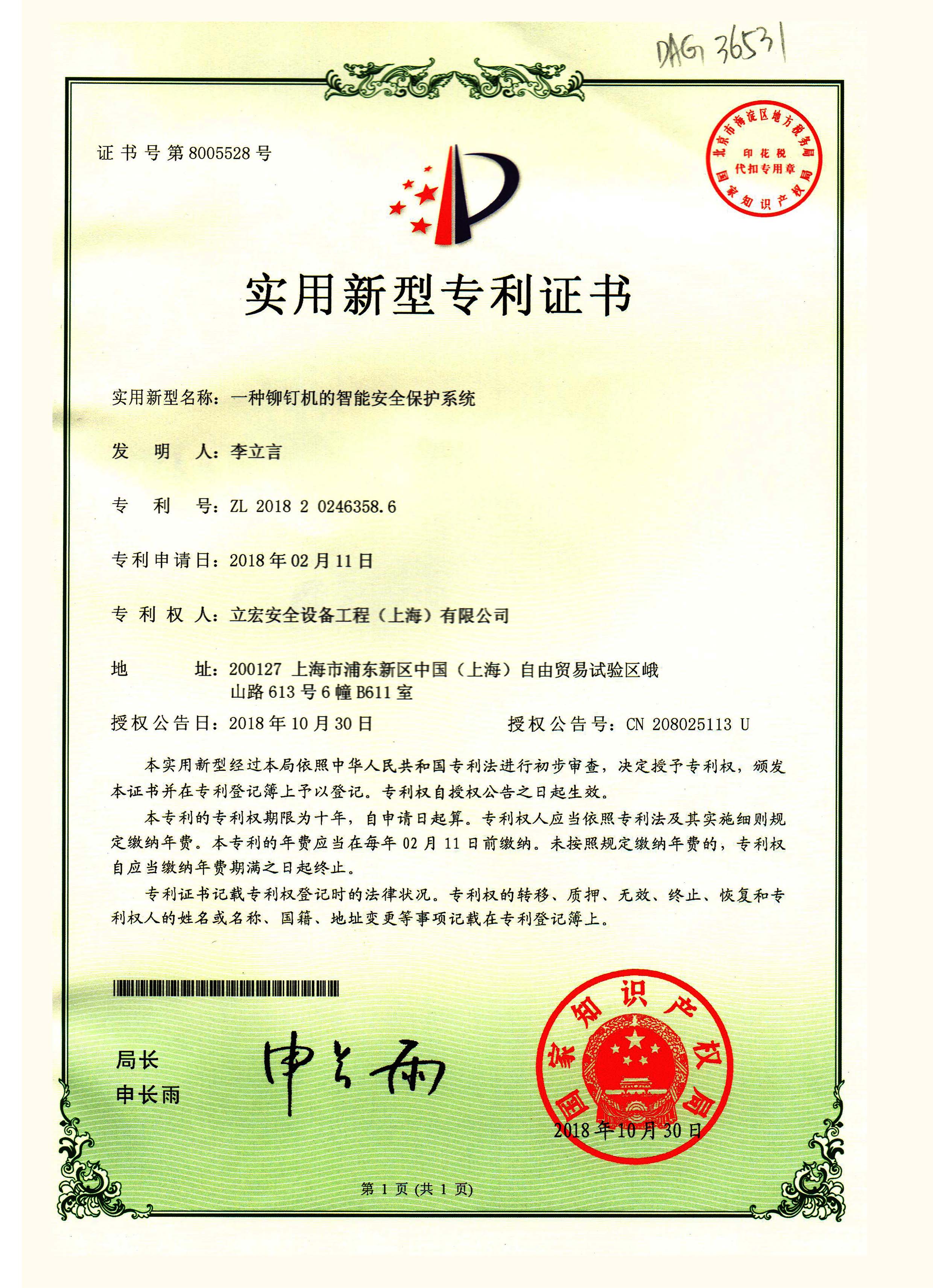 實用新型名稱:一種鉚釘機的智能安全保護系統專利號:ZL201820246358.6